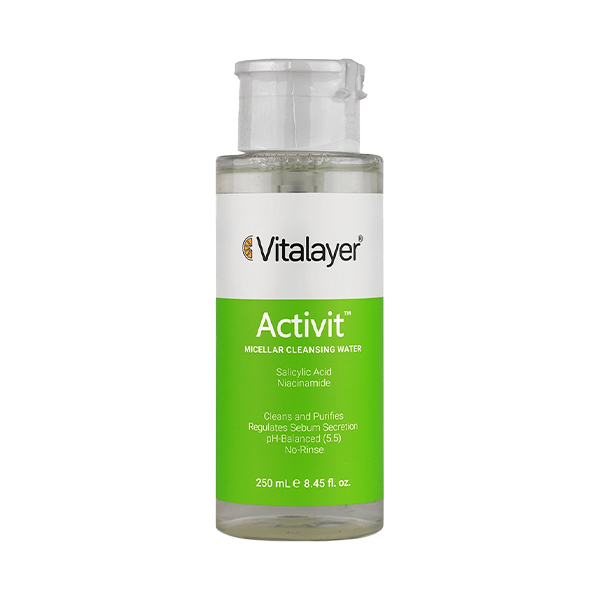 محلول پاک کننده آرایش کنترل چربی و ضد جوش ویتالیر مدل Activit حجم 250 میل، محصولی تخصصی برای پاکسازی ملایم و مؤثر پوستهای چرب و مختلط است. این محلول با فرمولاسیون میسلار و بهرهگیری از سالیسیلیک اسید, نیاسینامید و عصارههای طبیعی, به کنترل چربی، کاهش التهاب و از بین بردن باکتریهای مولد آکنه کمک میکند. فرمولاسیون ویژه آن، ضمن پاکسازی عمیق منافذ.