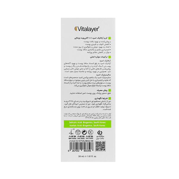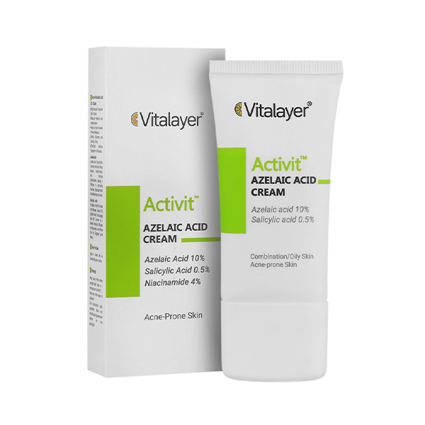 ✔ ویژگیهای برجسته کرم ضد جوش و لایه بردار حاوی آزلاییک اسید ۱۰٪ ویتالیر مدل Activit حجم 30 میل