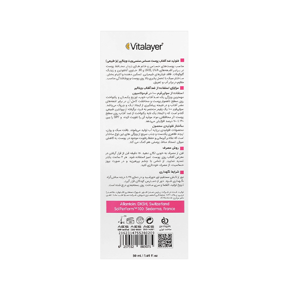 ✔ ویژگیهای برجسته فلویید ضدآفتاب بی رنگ با SPF50 ویتالیر مدل Sensi-Vit حجم 50 میل