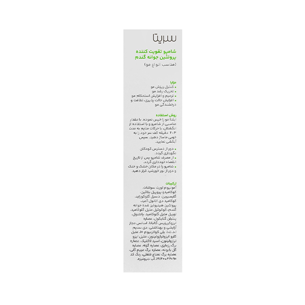 مشخصات کلیدی | شامپو سریتا - تقویت کننده و مغذی - حاوی پروتئین جوانه گندم - افزایش استحکام مو - ترمیم کننده موهای آسیبدیده - مناسب انواع مو - فاقد پارابن |