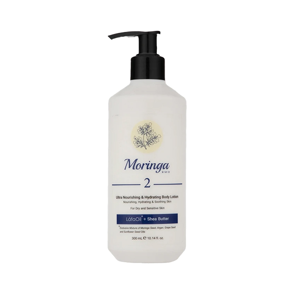 لوسیون بدن فوق مغذی و آبرسان مورینگا امو مخصوص پوستهای خشک و حساس مدل شماره 2 حجم 300 میل