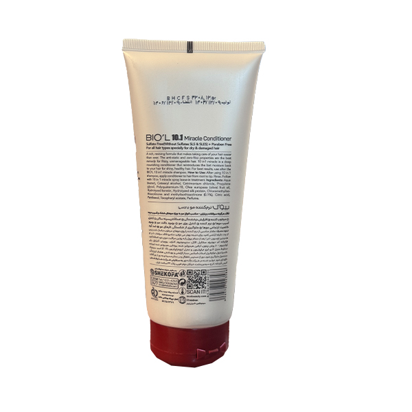 نرم کننده موی بیول (Biol) مدل ۱۰ در ۱ (با آبکشی), یک نرم کننده تخصصی با ساختار کرمی است که به طور اختصاصی برای انواع مو، به ویژه موهای خشک و آسیب دیده طراحی شده است. این محصول با هدف ترمیم ۱۰ نوع آسیب رایج, دارای فرمولاسیون فاقد سولفات، پارابن و سدیم کلرید است. ترکیبات فعال و ترمیم کننده این نرم کننده شامل کراتین هیدرولیز شده, پروتئین ابریشم و روغن زیتون است. کراتین و پروتئین ابریشم به طور مؤثری کوتیکولهای باز شده مو رو پر و صاف کرده و به ترمیم پیوندهای آسیبدیده مو کمک میکنن. این نرم کننده با افزایش خاصیت ارتجاعی و لطافت مو, از شکستگی و ایجاد موخوره جلوگیری مینماید و به دلیل داشتن پروویتامین B5, رطوبت مورد نیاز مو رو تأمین میکنه.