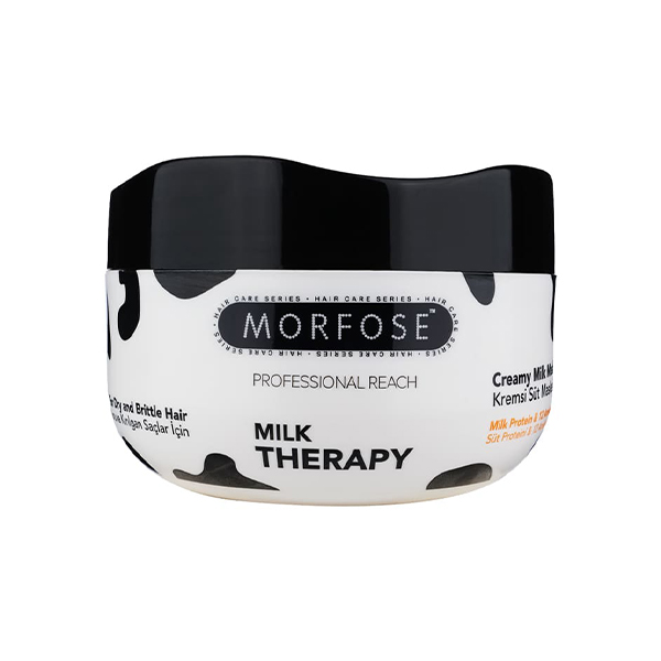 ماسک موی مورفوس (Morfose) مدل Milk Therapy (شیر درمانی), یک ماسک داخل حمام (با آبکشی) با حجم ۵۰۰ میلیلیتر است که به طور تخصصی برای موهای خشک، شکننده و آسیب دیده طراحی شده است. این ماسک از نسل محصولات درمانی و حرفهای است که با هدف بازگرداندن نشاط، نرمی و درخشش به موها تولید شده است. فرمولاسیون این محصول فاقد پارابن و سولفات بوده و حاوی ترکیبات مغذی و ترمیمکننده ساختاری شامل پروتئین شیر و ۱۲ نوع آمینو اسید ضروری است. پروتئین شیر تعادل رطوبت موهای خشک رو تنظیم کرده و به ترمیم سطح آسیب دیده موها کمک میکنه. ۱۲ آمینو اسید به عنوان واحدهای سازنده، استحکام فیبر مو رو تقویت کرده و از شکنندگی و ایجاد موخوره جلوگیری مینمایند. این ماسک بافت سبک کرمی داره و هیدراتاسیون عمیق رو بدون ایجاد چربی یا سنگینی روی موها فراهم میکنه.