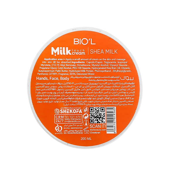 کرم مرطوب کننده و مغذی دست و صورت بیول حاوی پروتئین شیر و شی باتر مناسب پوستهای خشک و معمولی حجم ۲۰۰ میل